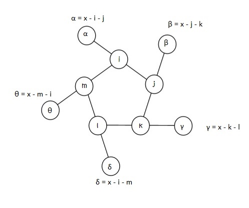 x = α + i + j = β + j + k = γ + k + l = δ + l + m = θ + m + i